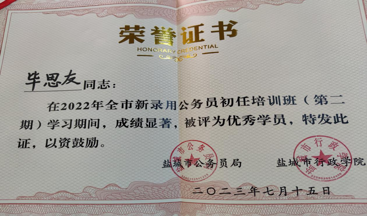 近日,从盐城市2022年新录用公务员第二期初任培训班获悉,我院办公室检察官助理毕思友同志荣获“优秀学员”称号。