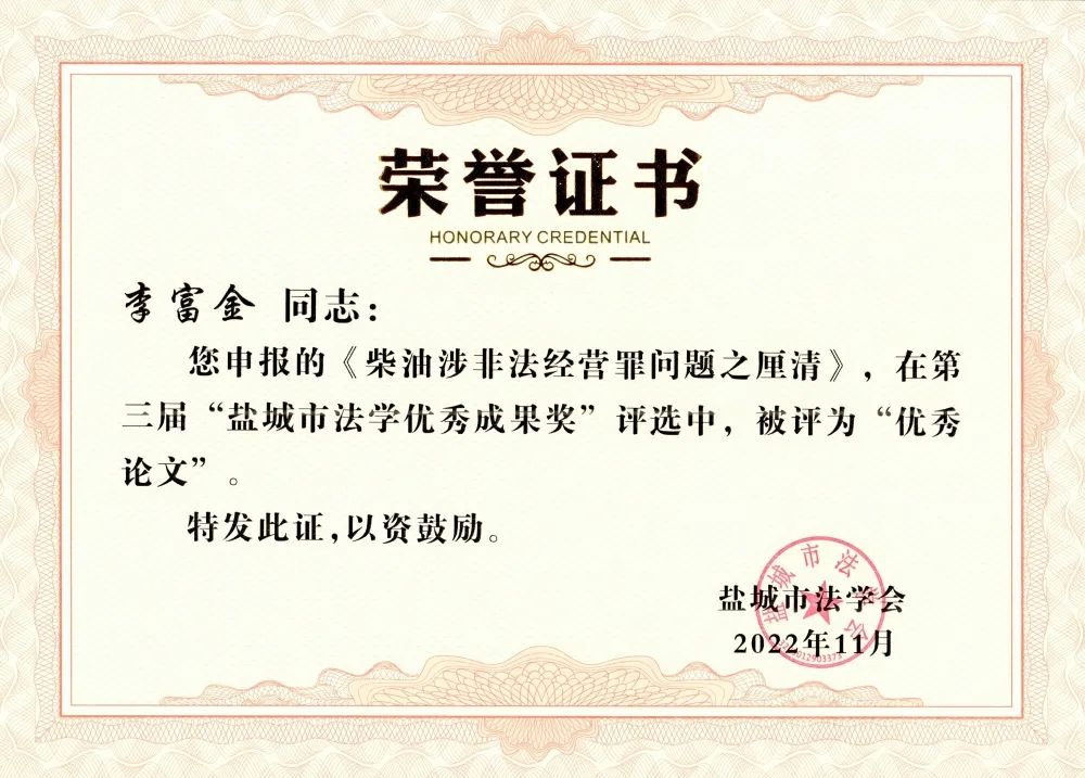 近日,从盐城市法学会获悉,我院党组副书记、副检察长李富金同志撰写的《柴油涉非法经营罪问题之厘清》一文,获评“盐城市法学优秀成果奖优秀论文”。
