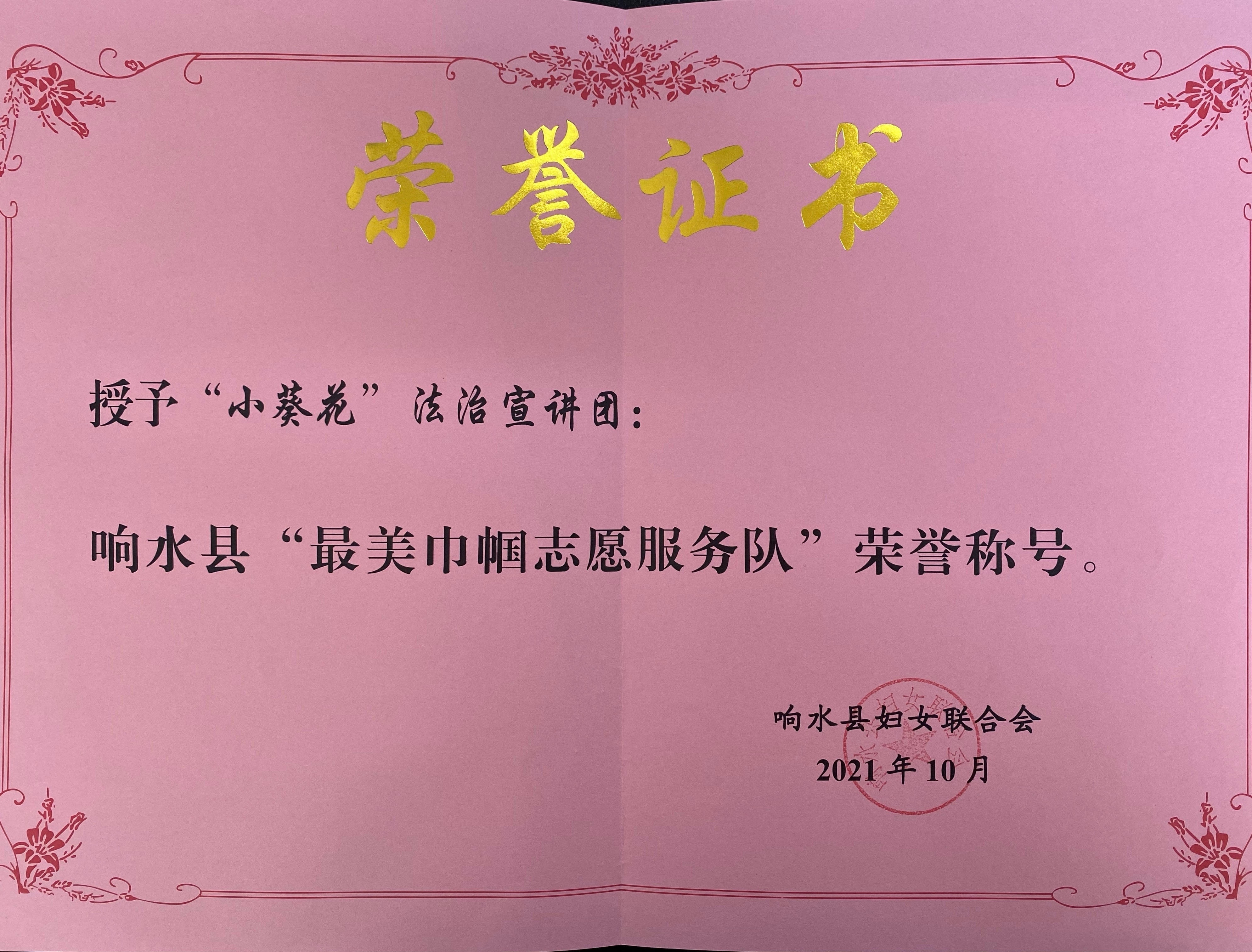 11月4日下午,县妇联举行2021年“最美巾帼志愿者(服务队)”揭晓暨“暖心故事”分享活动,我院“小葵花”法治宣传团获评全县“最美巾帼志愿服务队”,刘苗苗同志获评全县“最美巾帼志愿者”。