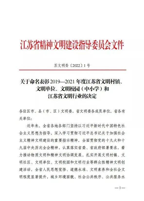 近日,省精神文明建设指导委员会发布《关于命名表彰2019——2021年度江苏省文明村镇、文明单位、文明校园(中小学)和江苏省文明行业的决定》,我院被授予“2019——2021年度江苏省文明单位”荣誉称号。